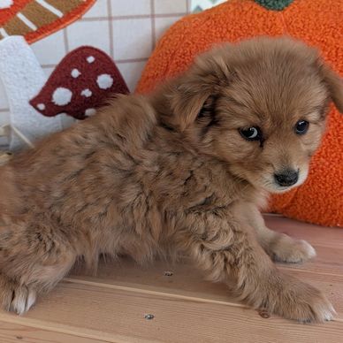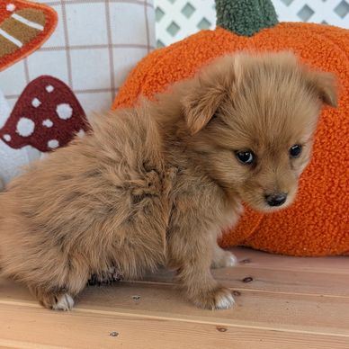 Kelly is a female Foxy Pomeranian who has a fluffy, auburn double coat with honey hues. She has white on her paws and chest. She is the snuggliest of her siblings.
