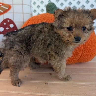 Bosley is a male Foxy Pomeranian who has a fluffy dark coat with dark brown, black, and honey hues. He has a sweet honey face with touch of black. He is a frisky little boy!