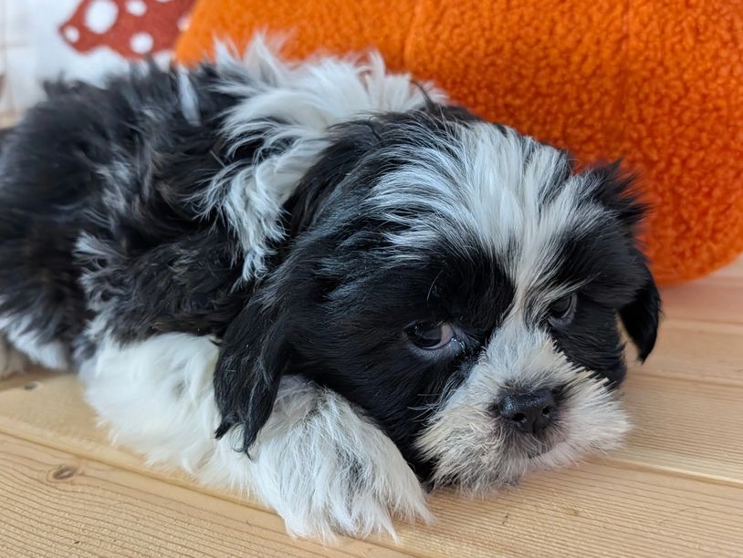 Zeke is a male Shih Tzu who has a fluffy black and white coat. He has white paws and a white tipped tail. He also has a handsome white plume on his head.