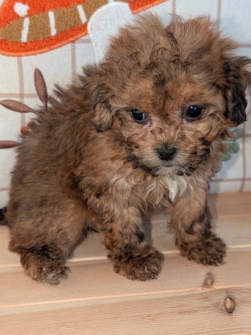 Shirley Temple, AKA Sweetness, is a female Shihpoo who has an extra curly and fluffy coat with auburn, dark chocolate, and honey hues. She also has a little white on her chest. She is shy girl who loves to snuggle with her human friends.